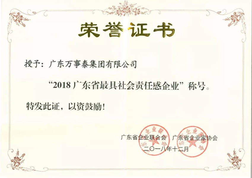 「喜訊」萬事泰榮獲“2018廣東省最具社會責任感企業(yè)”稱號推薦