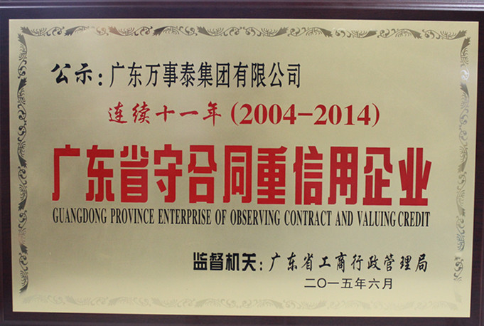 誠信在心,方能鑄就一流百年企業2015年12月10日 ,以萬事泰集團為首的46家企業,在新興縣工商局隆重接過了2014年度“廣東省守合同重信用企業”的榮譽牌匾。這是秉承“誠信在心,方能鑄就一流百年企業”的萬事泰集團連續11年獲得該榮譽稱號。當天授匾儀式上,新興縣工商局局長陳小紅系統總結了2014年度“廣東省守合同重信用企業”公示工作的總體情況。據其介紹,今年全縣共有49家企業公示為“廣…