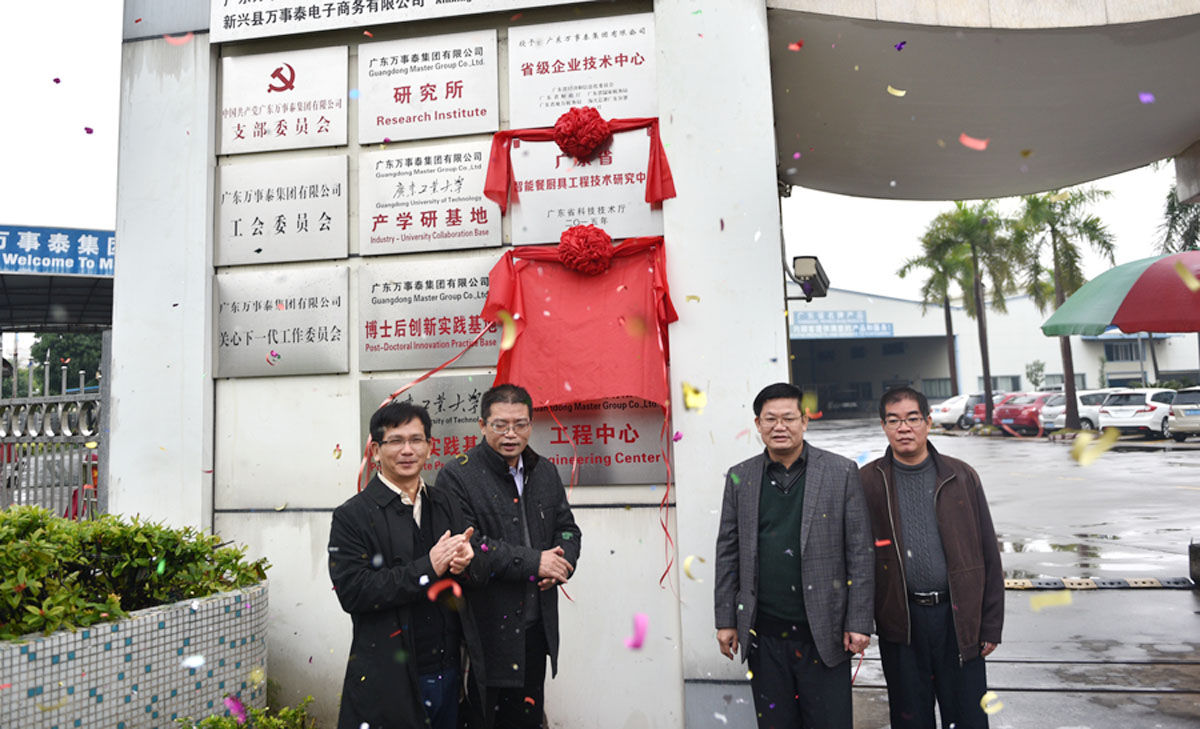 集團訊? 2016年1月15日上午10時,廣東萬事泰集團隆重舉行省級“智能餐廚具技術工程研究中心”、“萬事泰集團與北京科技大學聯合研發中心”揭牌儀式。云浮市科技局局長曾云鋒,云浮市科協主席、市科技局黨組副書記梁敏君,北科大廣東研究院院長何新波,新興縣副縣長岑樹德,新興縣科技局局長梁偉強、副局長梁瑞霞,新興縣經信局局長伍文才、副局長梁奮強,萬事泰集團董事長梁桂泉、常務副總裁劉炳耀、