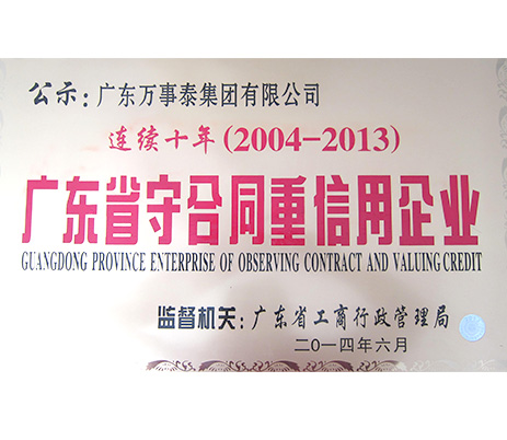 今年,我縣在網(wǎng)上申報(bào)公示守合同重信用的企業(yè),萬事泰集團(tuán)通過考核獲得2013年度“廣東省守合同重信用企業(yè)”連續(xù)10年的稱號(hào)。