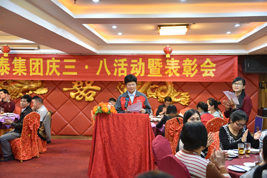 下午6時許,廣東萬事泰集團在南豪酒店2樓宴會大廳宴開50圍,隆重舉行慶祝“三八”國際婦女節活動暨表彰大會活動。34名集團2015年三八紅旗手接受頒獎。