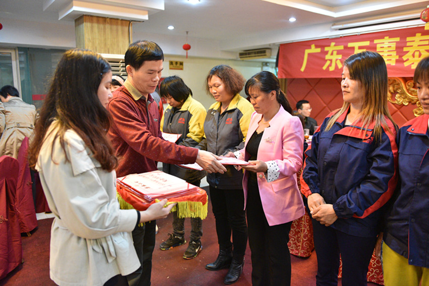 在這個特別的日子里,為了讓女員工們享受到作為女性的幸福和快樂,感受到萬事泰集團對員工的關懷與愛護,公司組織員工聚餐,歡度三八婦女節。集團10級以上女員工、“三八”紅旗手、2015度優秀女員工共500余人參加慶祝活動,新興縣婦聯副主席梁翠英、縣經貿系統黨委副書記、工會主席陳婉華等領導出席活動,萬事泰集團黨支部書記陳永錦、工會主席梁洪光、財務總監梁玉芳為“三八”紅旗手頒發了證書和獎金,向全體女員工致以節日的問候和送上美好的祝愿。