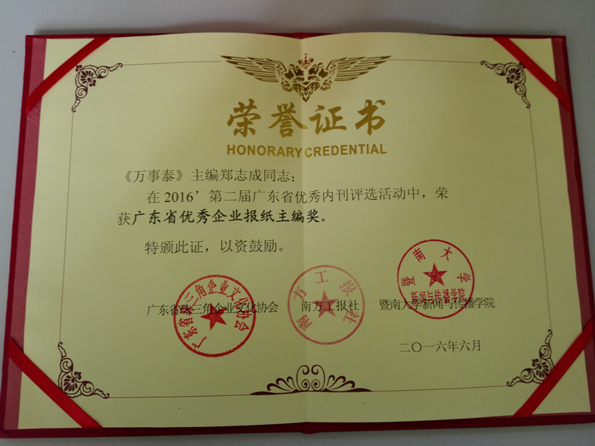 集團(tuán)訊 2016年7月4日,2016第二屆廣東省優(yōu)秀內(nèi)刊頒獎活動在暨南大學(xué)新聞與傳播學(xué)院隆重舉行。廣東萬事泰集團(tuán)月報《萬事泰》獲評“廣東省優(yōu)秀企業(yè)報紙獎”,《萬事泰》主編鄭志成獲得廣東省優(yōu)秀企業(yè)報紙主編獎。