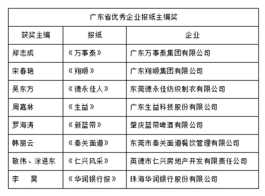 廣東省優(yōu)秀企業(yè)報紙主編獎獲獎名單。