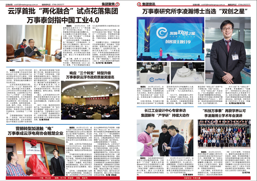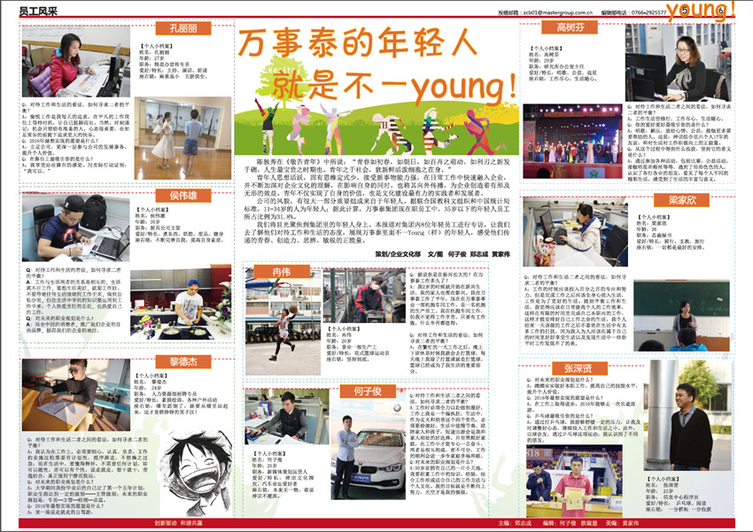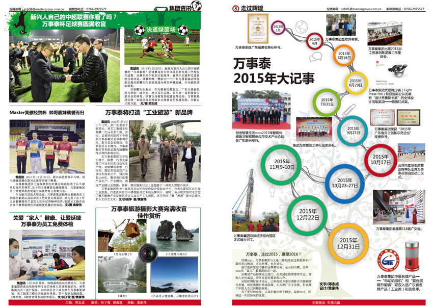 《萬事泰》是廣東萬事泰集團(tuán)的企業(yè)月報,由集團(tuán)企業(yè)文化部負(fù)責(zé)編輯出版,在部門同事鄭志成、歐淑慧、何子俊、黃家偉、黎家良的協(xié)作努力下,在集團(tuán)領(lǐng)導(dǎo)、員工的鞭策和支持下,不斷將內(nèi)刊從選題策劃、欄目設(shè)置、稿件標(biāo)準(zhǔn)、版式設(shè)計上進(jìn)行升級改進(jìn),為廣大萬事泰員工奉獻(xiàn)一份“從一線來、到一線去”的接地氣的內(nèi)刊報紙,建設(shè)成企業(yè)內(nèi)部資訊上傳下達(dá)的暢通平臺,傳遞實用有趣、積極向上的資訊內(nèi)容和集團(tuán)理念,助力集團(tuán)的蓬勃發(fā)展。
