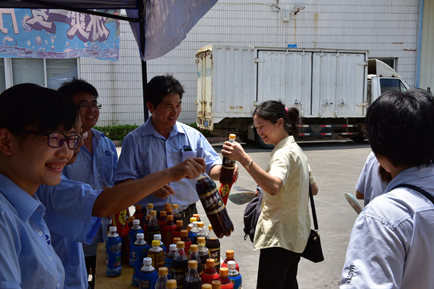 隨后,活動的發起部門企業文化部與行政部代表驅車將冰鎮飲品送往嘉事泰玻蓋車間,為100余名員工送去清涼,事業四部副總經理李耀聯合管理層,親自將飲料送到車間員工手中。