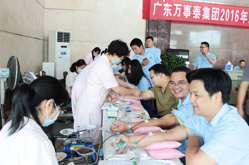 集團訊 2016年7月29日上午8時許,在萬事泰總部大堂舉行2016年無償獻血活動,近百名員工參加義務獻血。在醫護人員的指導下,萬事泰集團員工有序地填表、測血壓、排隊化驗,現場充滿溫情。