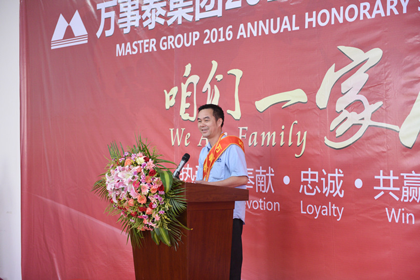 當(dāng)天下午4點(diǎn)30分,頒獎(jiǎng)典禮緩緩拉開(kāi)序幕。執(zhí)行總裁劉總致辭,他說(shuō)道:這是集團(tuán)家人們一年一度的團(tuán)聚,讓我們?cè)谄床娜兆永锊煌跣模聛?lái)聊聊,過(guò)去的成長(zhǎng)與收獲,從而再次精神飽滿地出發(fā)。萬(wàn)事泰集團(tuán)從成立、發(fā)展壯大至今,二十余年風(fēng)雨兼程,在座的各位榮譽(yù)員工,是萬(wàn)事泰成就輝煌的參與者、見(jiàn)證者,集團(tuán)的每一個(gè)成就、每一次突破,都凝結(jié)著你們的青春、智慧和汗水。集團(tuán)奉行“以人為本”,堅(jiān)持人才戰(zhàn)略,每一位把青春、智慧和忠誠(chéng)奉獻(xiàn)給萬(wàn)事泰的榮譽(yù)員工,都是集團(tuán)最寶貴的財(cái)富。你們多年始終如一、矢志不渝,勤奮、拼搏、務(wù)實(shí)、忠誠(chéng)、細(xì)心等優(yōu)秀可貴的品質(zhì),就是對(duì)“工匠精神”的完美詮釋。萬(wàn)事泰因?yàn)橛心銈兲泶u加瓦而越加精彩卓越,我希望各位榮譽(yù)員工能在各自的崗位上守土有責(zé),做好楷模表率,影響帶動(dòng)年輕人,傳承發(fā)展“萬(wàn)事泰精神”,與集團(tuán)一同譜寫(xiě)新的篇章。