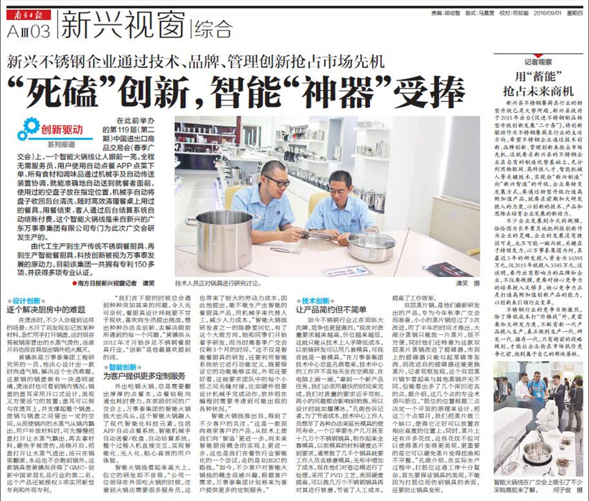 如今不銹鋼行業正在面臨大洗牌,競爭也更顯激烈。“現在對質量要求越來越高,價位越來越低,這就只能從技術上入手降低成本。以前搞研發可以用幾套模具,可現在就是一套模具。”在萬事泰集團技術中心總監孔萌看來,技術中心的工作并不是每天坐在空調房、在電腦上畫一畫。“拿到一個新產品任務,我們必須用最快的時間來完成。我們對質量的要求近乎苛刻,再小的問題都會影響到銷售,所以設計時就如履薄冰。”孔萌告訴記者,為了節省成本,技術中心工作人員想盡了各種辦法來延長模具的使用壽命。一個訂單要生產幾萬甚至十幾萬個不銹鋼鍋具,制作起來全靠模具,以前模具的材料硬度達不到要求,通常做了幾千個鍋具就要工作人員去修磨模具,無形中增加了成本。現在他們對卷邊模進行了處理,采用了PVD 工藝,表面硬度提高,可以做幾萬個不銹鋼鍋具再對其進行修磨,節省了人工成本,提高了工作效率。
