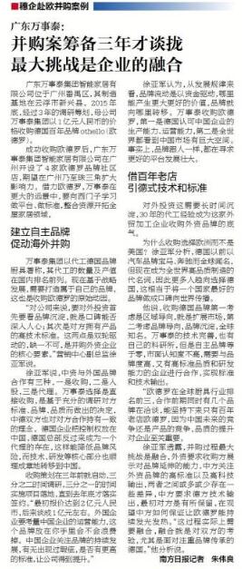 他說,收購德國品牌第一考慮是區域導向,就是擴展市場,第二考慮品牌導向,品牌沉淀,全球知名。萬事泰的技術完善,也有自己的科研所,但是自主品牌等于零,市面認知度不高,需要與品牌度高,又有高標準品質和研發能力的企業進行合作,實現標準和技術輸出。