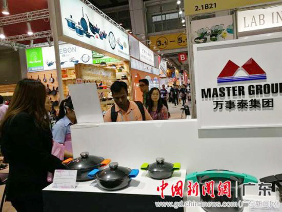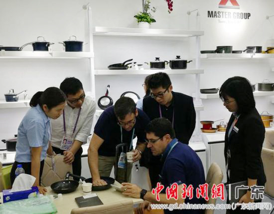 記者在廣交會上看到,膚色不同的國外采購商對廣東萬事泰集團展區豐富的不銹鋼餐廚具產品頗感興趣,現場咨詢、下單者絡繹不絕。