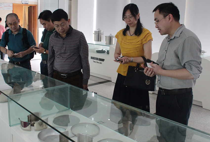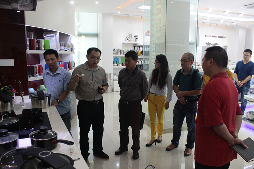 隨后調研組的領導們來到了萬事泰智能廚房多功能展廳參觀,總裁辦助理歐劍華為調研組的領導們介紹了集團公司不銹鋼產品、鋁制品的工藝特點,以及萬事泰自主研發的智能烹飪臺E-cook table和帶有溫度傳感器的不粘鍋,為調研組一行展示了萬事泰科技創新轉型升級的新產品和新方向。