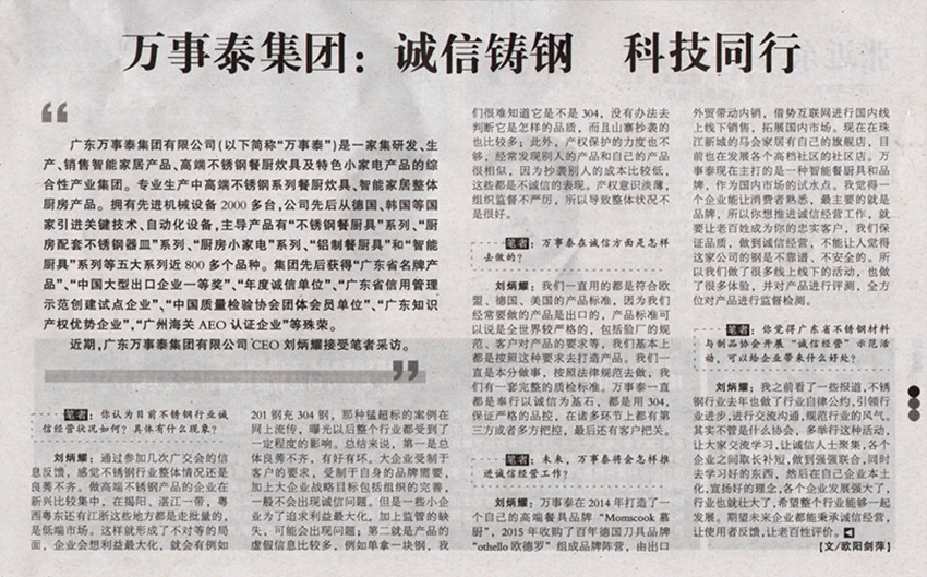 劉炳耀:萬事泰在2014年打造了一個自己的高端餐具品牌“Momscook慕廚”,2015年收購了百年德國刀具品牌“othello歐德羅”組成品牌陣營,由出口外貿帶動內銷,借勢互聯網進行國內線上線下銷售,拓展國內市場。現在在珠江新城的馬會家居有自己的旗艦店,目前也在發展各個高檔社區的社區店。萬事泰現在主打的是一種智能餐廚具和品牌,作為國內市場的試水點。我覺得一個企業能讓消費者熟悉,最主要的就是品牌,所以你想推進誠信經營工作,就要讓老百姓成為你的忠實客戶,我們保證品質,做到誠信經營,不能讓人覺得這家公司的鋼是不靠譜、不安全的。所以我們做了很多線上線下的活動,也做了很多體驗,并對產品進行評測,全方位對產品進行監督檢測。