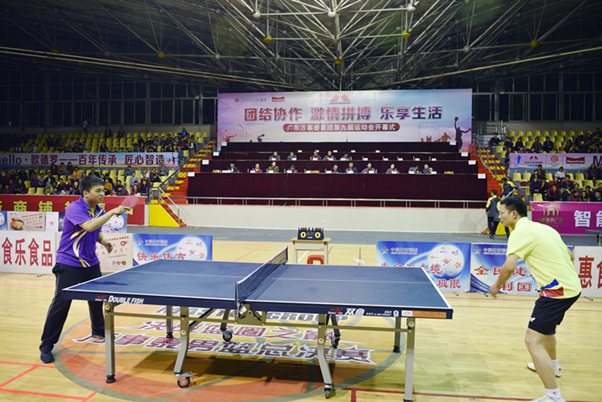 在絢爛奪目禮炮下,工作人員已經(jīng)布置好了乒乓球表演賽的場地,集團(tuán)乒乓球優(yōu)秀選手伍時(shí)煥與張深賢在此奉獻(xiàn)了一場精彩絕倫的比賽。乒乓球在空中旋轉(zhuǎn)著,揮擊著理想,汗水落地成花,像象征著萬事泰力爭上游的干勁。