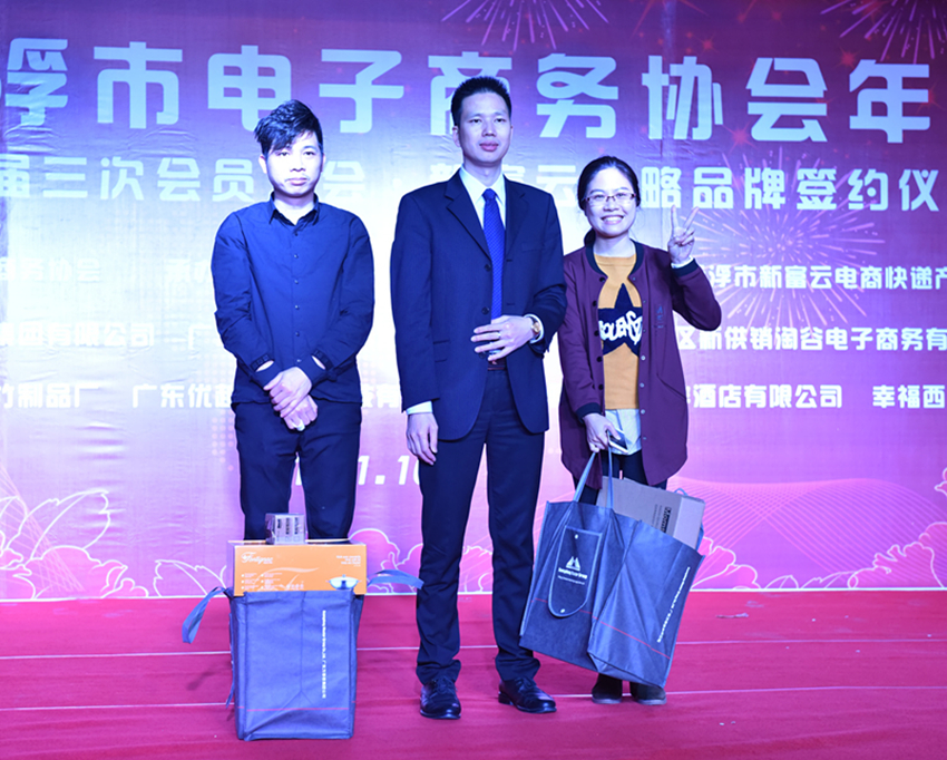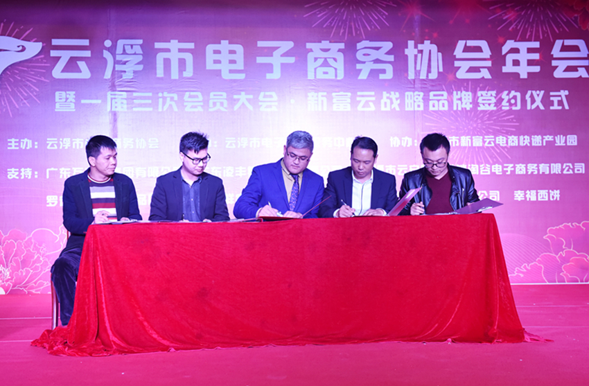 集團訊 2017年1月10日下午4時許,2017云浮市電子商務協會年會暨一屆三次會員大會在云浮市新富云電商快遞家居產業園內日常召開,同期,并與新富云電商快遞產業園達成合作意向,舉辦“新富云戰略品牌簽約儀式”。