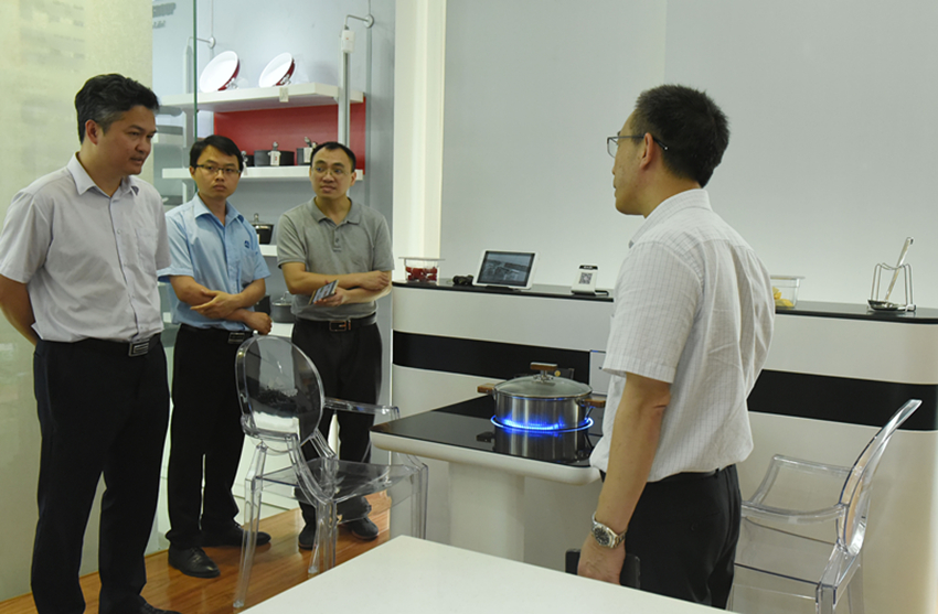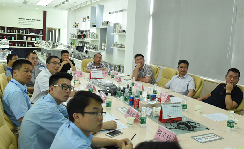 譚杰斌一行先后來到集團檢測中心、省級技術中心以及四樓產品展示廳,并在四樓展示廳開展“工業設計調研”座談會。