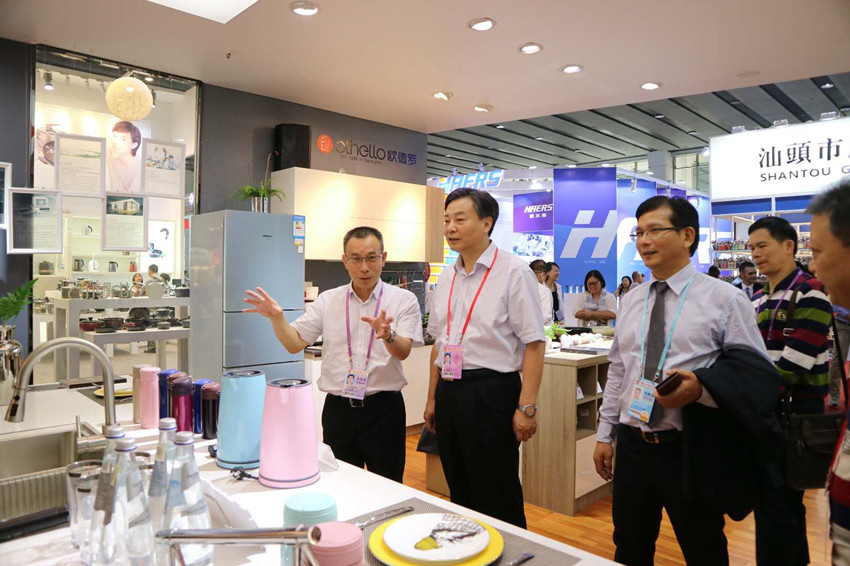 施東紅一行參觀萬事泰othello歐德羅智能整體廚房、2017阿斯塔納世博會中國館專用紀念品展臺、及OEM商品展區(qū)。