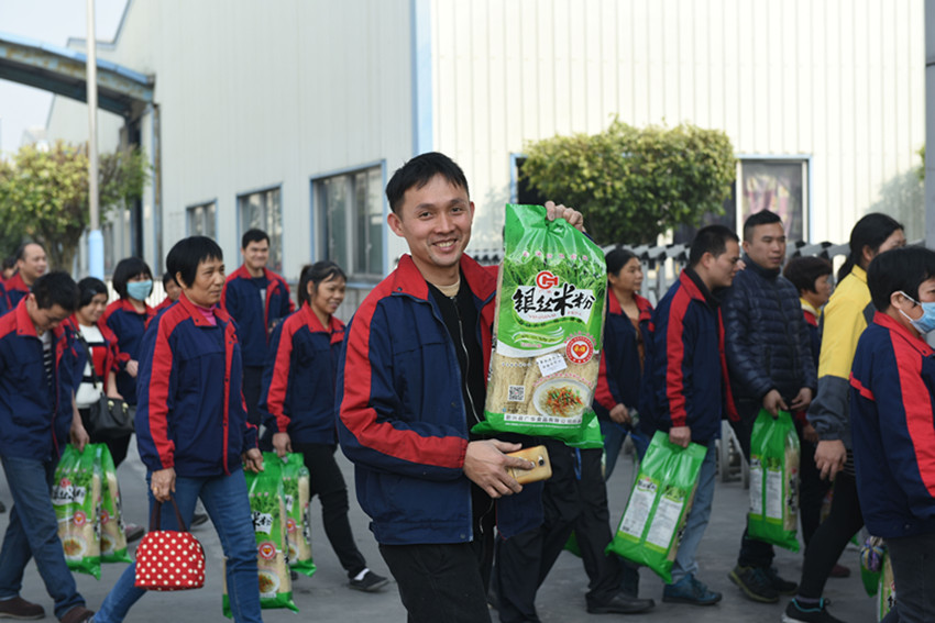 員工們接過福利后歡聲笑語 。