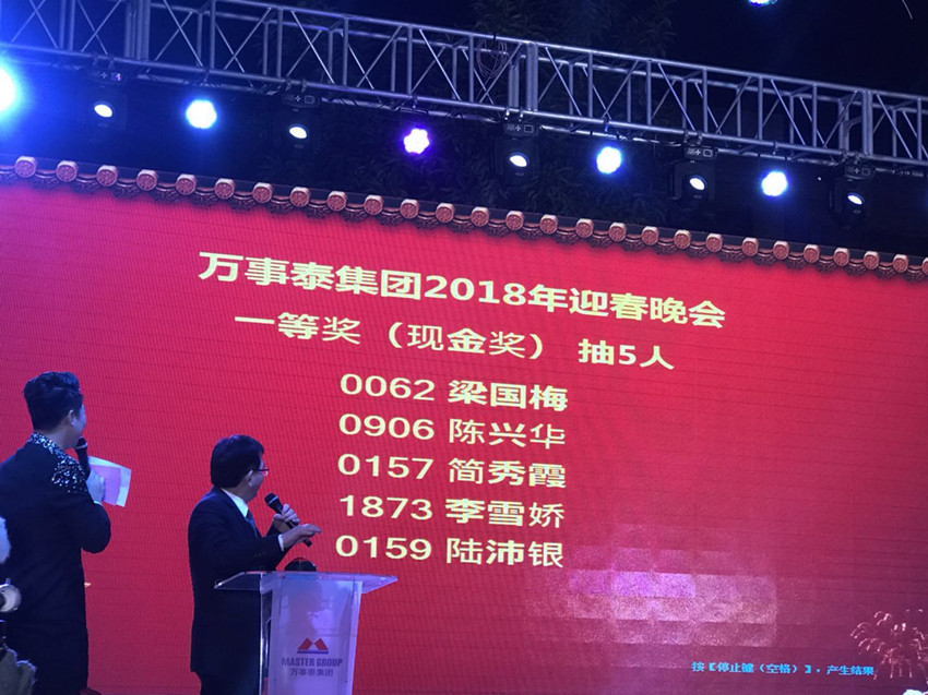 集團(tuán)訊 凱歌辭舊歲,駿狗迎新春。2月8日晚,新時(shí)代、新思維、新征程——2018年廣東萬事泰集團(tuán)迎春晚會(huì)隆重舉行,縣領(lǐng)導(dǎo)、新城鎮(zhèn)、太平鎮(zhèn)等相關(guān)領(lǐng)導(dǎo),萬事泰集團(tuán)董事長(zhǎng)梁桂泉、常務(wù)副總裁劉炳耀及相關(guān)各部門領(lǐng)導(dǎo)、員工們,供應(yīng)商代表等一同歡聚一堂,共慶新春。