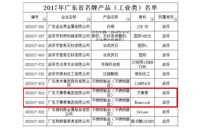 集團訊 日前,“2017年度廣東省名牌產品”名單正式公布。廣東萬事泰集團旗下品牌萬事泰、Momscook慕廚產品,在眾多品牌的角逐中脫穎而出,榮膺“廣東省名牌產品”稱號。