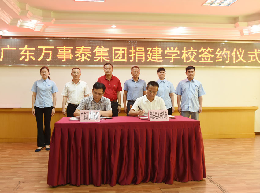 集團訊 6月27日上午,廣東萬事泰集團捐建學校簽約儀式在新興縣委縣政府大樓縣委會議室隆重舉行。集團董事長梁桂泉先生與新興縣政府袁伙月縣長簽署了《捐資建校協議書》,萬事泰集團向新興縣人民政府捐贈建校資金5000萬元在新興縣城南片區新建一所高標準完全小學,新學校將被命名為“新興縣萬事泰實驗學?!?。儀式由新興縣梁志蓮副縣長主持,袁伙月、梁國華、黃偉勝等縣領導;縣直有關單位負責人;各鎮黨委或政府主要負責人;新州教育基金會負責人;縣教育局有關領導;縣直屬學校、新城鎮中心小學校長以及萬事泰集團主要管理人員出席。