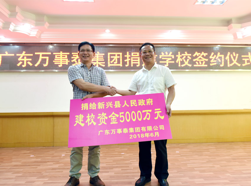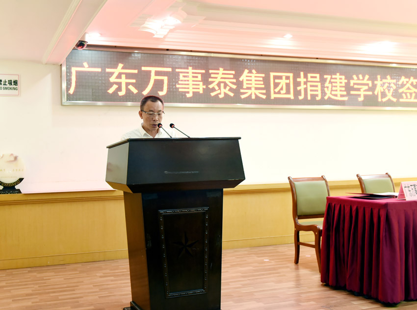 萬事泰集團常務副總裁劉炳耀先生代表集團上臺致辭,他表示,萬事泰今天捐資5000萬元建設新興縣萬事泰實驗學校,是以實際行動關心與支持家鄉的教育事業發展,為縣委縣政府實施建設教育強縣戰略、解決當前我縣城鎮化建設步伐加快與基礎教育學位緊張的矛盾盡一份綿薄之力。