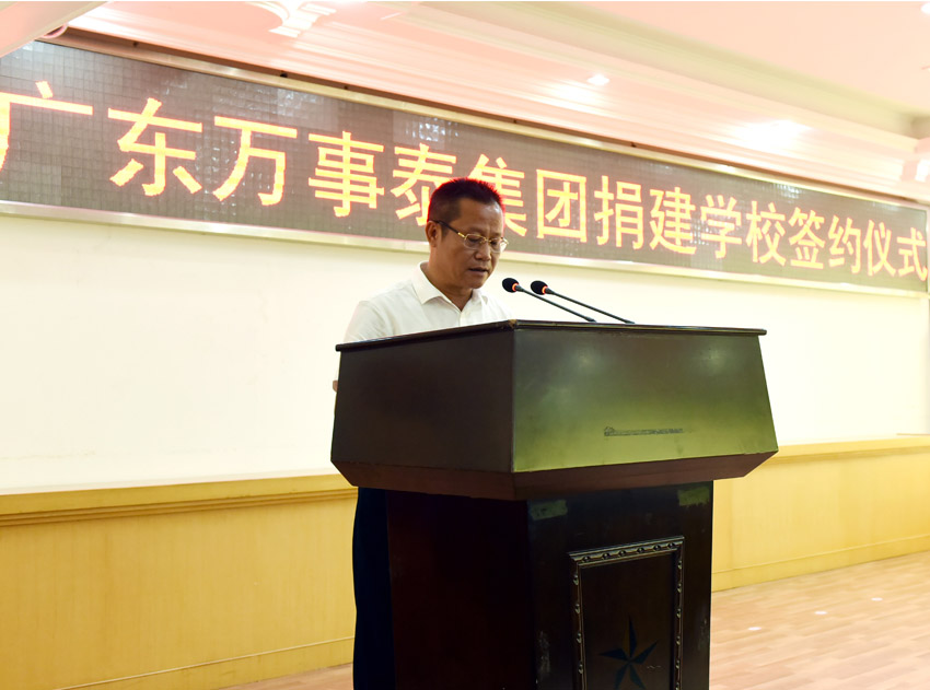 縣委副書記、縣長袁伙月代表新興縣委、縣政府作了講話,他對萬事泰集團捐資辦學、熱心公益之舉表示了高度贊揚和衷心感謝。他指出,縣委、縣政府歷來都高度重視教育事業的發展,充分發揮社會力量捐資辦學,進一步改善和提升基礎教育質量和水平,是一條可行的辦法。袁縣長要求,各有關職能部門要關心、支持項目建設,密切配合,盡快部署前期工作,落實建設籌備工作,確保新學校如期建成,如期啟動招生工作,要把萬事泰集團捐建的新興縣萬事泰實驗學校辦成一所讓學生向往、家長放心、社會滿意的優質學校。