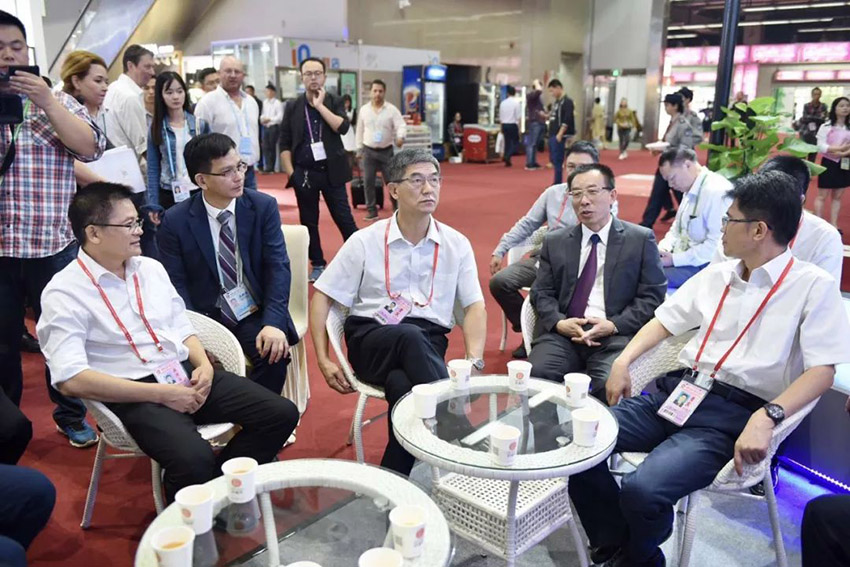 劉總代表新興縣不銹鋼商會與萬事泰集團向調研領導分別作了工作匯報,詳細介紹了企業發展情況、應對中美貿易摩擦的措施和本屆廣交會參展情況。