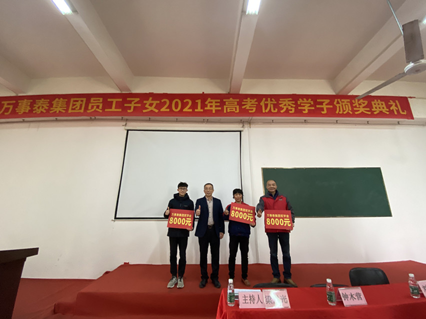 執行總裁劉炳耀在頒獎儀式上對學子們提出三點殷切希望:一是希望學子們立足大學這個新起點,志存高遠勇于克服困難,為自己的人生創造更多的選擇;二是希望學子們努力學習奮發成才,學成之后回饋社會建設家鄉;三是希望學子們懂得感恩,要感恩父母、感恩所有讓你們成長的人。同時也號召全體員工向本次接受表彰的29位員工家庭學習,立足崗位,敬業奉獻,干好本職工作的同時,重家教、樹家風,抓好子女教育,重視家庭建設,為國家培養更多棟梁之才,共同建設幸福家庭同時,共建萬事泰集團更美好明天!
